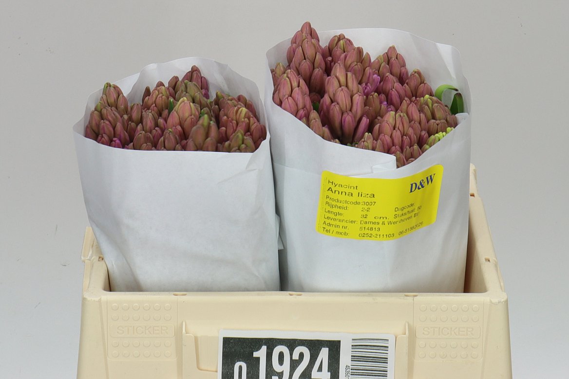 Hyacinthus Or Anna LizaDames & Werkhoven BVUnits Available 1 Length (cm) 32 Unit Content 25 Ripeness 2-2 Total Stock 25 Country of Origin NL
